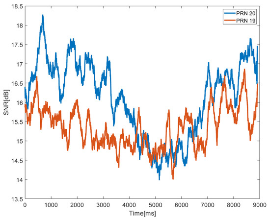 Figure 10 depicts the estimated SNR for two monitored satellites processing sample streams at the output of the four channels as an example. The SNR is calculated and is a reliable indicator of the received signal quality. It demonstrates that the values of SNR measured on samples taken from the hardware platform are presented in blue and red lines, respectively, indicating the available PRN 20 and 19 in the GPS system. Both signals are gathered and analyzed in 9 milliseconds in real-time reflection channels. The reflection channels are shown to have a constant collecting ability over the processing time.