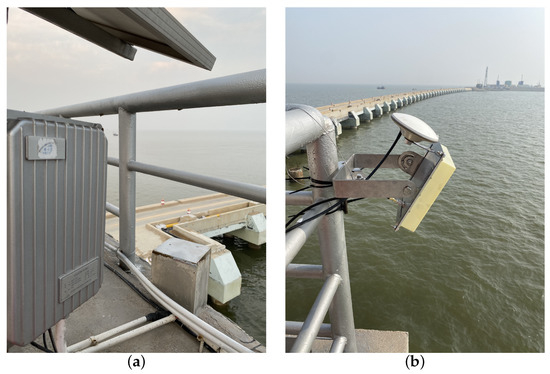 The direct signals are received using an RHCP L1/B1 antenna in the zenith direction. The reflected signals are received using an LHCP L1/B1 antenna slanted with an azimuth angle of 125 and an elevation angle of 45 towards the sea surface, as shown in Figure 14. The antennae are mounted on the wharf at a height of around 14.5 m above sea level. The wharf is attached with the supplied equipment case was installed on the wharf.