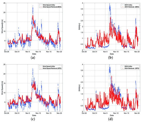 Retrieval results using Beidou system and GPS system, respectively: (a) Wind speed results using Beidou system; (b) Significant wave height results using Beidou system; (c) Wind speed results using GPS system; (d) Significant wave height results using GPS system.