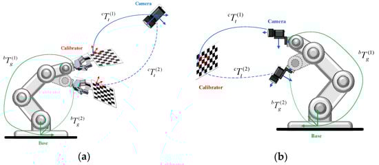 Two hand–eye calibration modes: (a) Eye-to-hand; (b) Eye-in-hand. Where Base represents the base coordinate system of the robot; Camera represents the camera coordinate system; and Calibrator represents the calibration board.