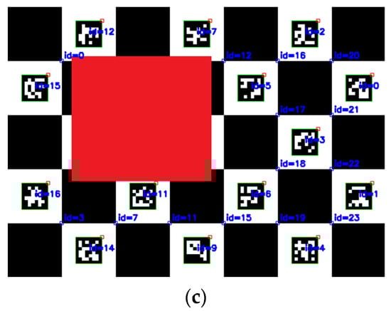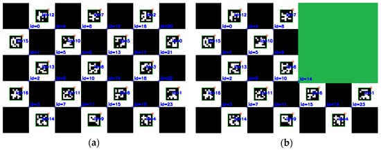 As shown in Figure 3, when corner detection was performed on the ChArUco board, the corners of the checkerboard and the coding pattern were identified. According to the decoding information of the coding pattern, the positions of each corner of the calibration board could be sorted in an orderly manner. Even if the ChArUco board was partially occluded, it did not affect the order of the corners.