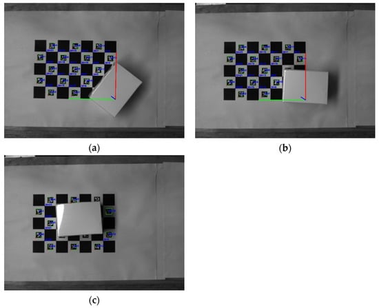 In online hand–eye calibration experiments based on the ChArUco board, 10 sets of online hand–eye calibration independent experiments were carried out. In a single set of independent experiments, 25 sets of robot teaching actions were set, and the ChArUco board was placed away from the center of the camera’s field of view. Figure 12 shows the change of the camera angle of view, before and after the online hand–eye calibration experiment based on the ChArUco board. Through the code identification of the ArUco marker on the ChArUco board, and the statistics of the identified code number, the position of the ChArUco board and its proportion in the image could be determined. It can be seen from the figure, that the posture recognition of the ChArUco board could be realized after the robot adjustment, through closed-loop feedback.