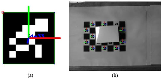According to the described mathematical model of hand–eye calibration, the solution process of hand–eye calibration needed to obtain the homogeneous matrix of the calibration board coordinate system, relative to the camera coordinate system, that is, it needed to calculate the external parameters of the camera. In this paper, the ChArUco board was selected as the calibration object to calculate .