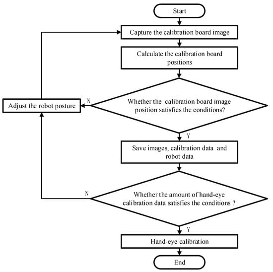 Figure 7 shows the online hand–eye calibration process, based on the ChArUco board. Firstly, after the robot moved to the teaching posture, the camera captured the ChArUco board calibration image. Then, it was judged whether the position of the calibration board satisfied the condition by detecting the ChArUco board. If it was not satisfied, the robot posture was automatically adjusted, according to the feedback of the ChArUco board position information, and the above steps were repeated. Otherwise, the data were saved, the posture of the robot adjusted, and the next teaching action was reached. When the collected hand–eye calibration data met the requirements, the hand–eye calibration matrix was solved.