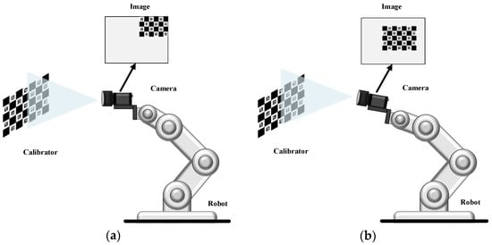 The application of industrial robots has greatly improved the production efficiency and product quality of enterprises [1,2]. However, the traditional working methods of industrial robots have been unable to meet the increasing production demand. Industrial robots equipped with vision sensors perceive the surrounding environment through image processing technology, which improves the “flexibility” of robot operations, and enables robots to complete more complex production tasks [3,4,5]. Hand–eye calibration is an indispensable part of the visual servo operation of the robot, which is an important bridge between the robot and the vision sensor. Hand–eye calibration is the process of solving the coordinate transformation relationship between the camera coordinate system and the robot coordinate system. The accuracy of hand–eye calibration directly affects the accuracy of the robot operation. For the research of hand–eye calibration, scholars have proposed many theories and methods. Wu et al. [6] and Yang et al. [7] solved the hand–eye problem by tracking the position of the calibration ball in 3D camera and the movement trajectory of the robot. Chen et al. [8] and Wang et al. [9] calibrated the relationship of the position between the camera and the calibrator by identifying the feature points of the 3D calibration object, and solved the hand–eye matrix through the corresponding posture of the robot. Although the hand–eye calibration method based on 3D calibrators is one of the most effective ways to solve the hand–eye matrix, the processing of 3D data consumes a lot of time, and the quality of the 3D point cloud has absolute influence on the calculation results.