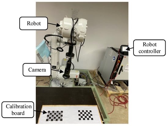 In this paper, Hikvision’s MV-CE050-30GM camera, FUJINON’s CF8ZA-1S lens and ABB’s IRB2600-20 robot were used to build the experimental platform. The experimental platform is shown in Figure 9. The camera was fixed on the end of the robot, and the calibration board was fixed on the experimental table. Based on this experimental platform, this paper tested the accuracy of the three calibration methods of the ArUco marker, the checkerboard and the ChArUco board, and carried out an online hand–eye calibration experiment based on the ChArUco board.