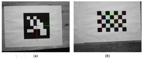ArUco markers have the advantages of flexibility and easy detection. However, the ArUco marker has the problem that the detection accuracy of the edge corners is not high. Even if sub-pixel processing is performed on the corner, the expected accuracy is still not achieved. The black and white interlaced pattern of the checkerboard makes the corners easy to detect. Unfortunately, the flexibility of the checkerboard is not as extensive as the ArUco marker. When the checkerboard was used as a calibration object, the checkerboard needed to be completely visible, and could be blocked. The ChArUco board possessed the advantages of both the checkerboard and the ArUco marker. In addition, the ChArUco board ameliorated the deficiencies of both. Figure 2 shows a schematic diagram of three calibration objects.