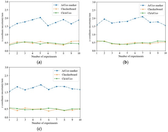 Figure 11 shows the hand–eye calibration uncertainty, based on the ArUco marker, the checkerboard and the ChArUco board. From the analysis of the experimental data, it could be seen that the hand–eye calibration accuracy of the ArUco marker was the worst, and compared with the checkerboard and the ChArUco board, the maximum deviation was 1.5 mm. Compared with the checkerboard and the ChArUco board, the calibration accuracy of the two was almost the same.
