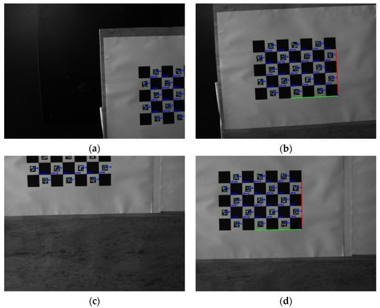 Online hand–eye calibration experiment, based on ChArUco board: (a,c) Image captured by camera before robot adjustment; (b,d) Image captured by camera after robot adjustment.