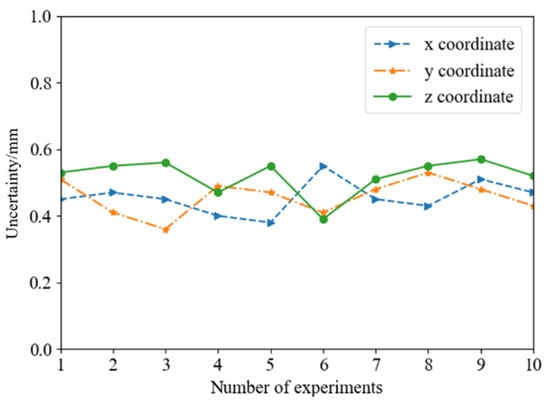 In addition, as shown in Figure 13, this paper conducted uncertainty analysis on 10 sets of online hand–eye calibration experiments. It can be seen from the figure, that the uncertainty of the online hand–eye calibration, based on the ChArUco board, is between 0.4 mm and 0.6 mm, which is almost the same as the accuracy of the offline hand–eye calibration. The experimental results showed that the method in this paper effectively solved the problem of online hand–eye calibration, and also ensured the stability of the calibration accuracy.