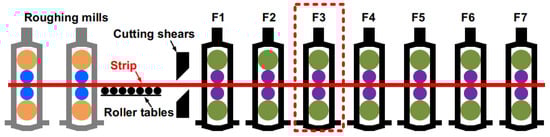 A hot strip mill is shown in Figure 1, including two four-high roughing mills, heat-preserving roller tables, cutting shears, seven four-high finishing mills (F1–F7), etc. The F3 finishing mill is selected as the motion analysis unit in this paper (red dashed box). The dynamic model of the RBBH system is established and the interaction between support rolls, rolling parts, main transmission system, mill housings, work rolls, and the flexible support of the bearing are considered.