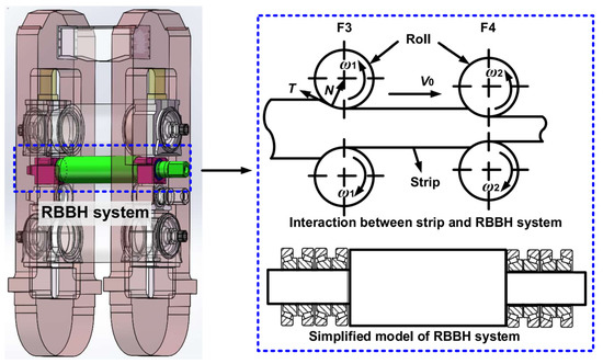 Strip rolling must undergo three production processes, i.e., the biting steel process, stable process, and polishing steel. In the whole rolling process, rolling speed and rolling force change rapidly with the running of the strip, resulting in variability in the dynamic stiffness and damping of support bearings; at the same time, the dynamic parameters of support bearings will cause the transient response of rolling. In order to express the relationship between the parts in the RBBH system intuitively, the analysis model is established (Figure 2). The RBBH system consists of the rolls, bearings, and housings, where the bearings and housings ensure the operational accuracy of the rolls and are an important influence on the surface quality of the product. In the same way, the operating condition of the rolls also affects the accuracy and life of the bearings and housings. The components in the RBBH system affect each other as a whole. The roll and the four-row bearings are regarded as an elastic structure and the flexible support, respectively. The following assumptions are made for the convenience of the solution.