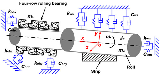 Incorporating the flexible support of four-row rolling element bearings, the dynamic model of the RBBH system is established as shown in Figure 3. mw and mb represent the equivalent inertial masses of the work roll and the four-row bearing and bearing housing. Jw and ωr are the equivalent moment of inertia and rolling angular velocity of the work roll, respectively. kohx, kohy, kohz, cohx, cohy, and cohz denote the equivalent stiffness and equivalent damping between the outer ring of the bearing and the bearing housing, respectively. kws and cws are the equivalent stiffness and equivalent damping between the work roll and the support roll, and kwm and cwm are the equivalent stiffness and equivalent damping of the connection between the work roll and the main drive system, respectively.