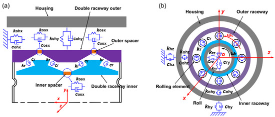 The dynamic characteristics of the four-row bearings and the roll in the RBBH system affect each other, and they provide an operating environment for each other. In order to obtain a more versatile RBBH system dynamic model and considering the contact stiffness and damping of the bearing, a universal four-row bearing dynamic model is established and the following assumptions are made. (1) The geometric center of each part coincides with the center of mass. (2) The inner ring and the roll have an interference fit. (3) The roll rotates around the center of mass and revolves around the axis of the inner ring. The center of mass of the roll and the inner ring can move in three-dimensional translation. The cage rotates around its central axis. The angular velocity is a fixed value and the outer ring is fixed. (4) The axial force is ignored. (5) The lubricating oil’s viscosity, viscosity–temperature, viscosity–pressure coefficient, density, and other parameters are confirmed. (6) The roller sliding in the bearing is not considered. (7) There is no radial clearance.