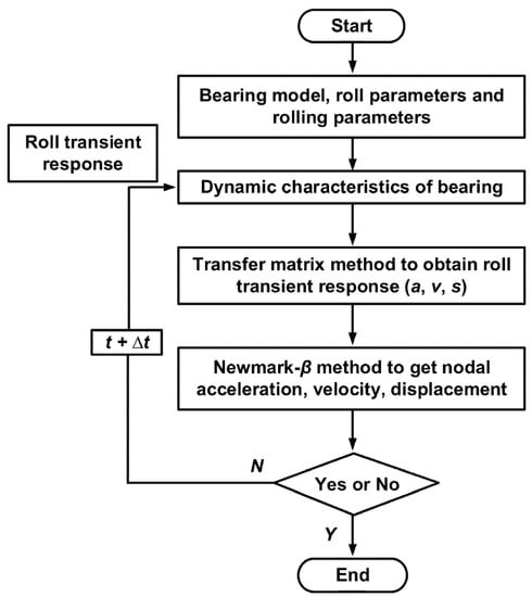 The dynamic response of the RBBH system will change with the rolling speed, rolling force, and other working conditions, which will affect the dynamic characteristics of support bearings. In order to accurately calculate the dynamic response of the system, the rolling speed, rolling force, and other working conditions are used as the initial conditions for solving the dynamic equations. Then, it is substituted into the transient response equation of the RBBH system, and the calculation is repeated until the system response is stable. The flowchart is shown in Figure 5.