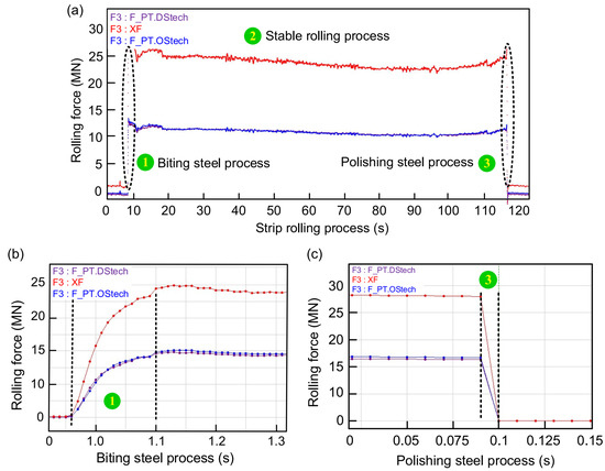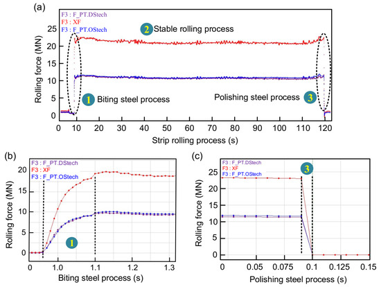 When the SPA-H of 1.6 and 3.2 mm are rolled, the changes in rolling force are given in Figure 6 and Figure 7. It can be seen from Figure 6a that the stable process rolling force fluctuation is very small and can be ignored. Figure 6b shows that the biting time lasts for 0.25 s and the total rolling force soars from 0 to 25 MN. Figure 6c shows that the polishing steel time lasts only 0.025 s and the rolling force is instantly reduced from 30 to 0 MN. Figure 7 presents the rolling force distribution with a finished product thickness of 3.2 mm. Compared with the rolling force with a finished product thickness of 1.6 mm, the value is reduced by approximately 5 MN and the rolling process is more stable.