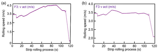 As shown in Figure 8a, the rolling speed of 1.6 mm continues to increase and the maximum is close to 4.5 m/s. Figure 8b shows that the rolling speed of 3.2 mm is maintained at about 3.5 m/s. Compared with 1.6 mm, the rolling process is relatively stable.