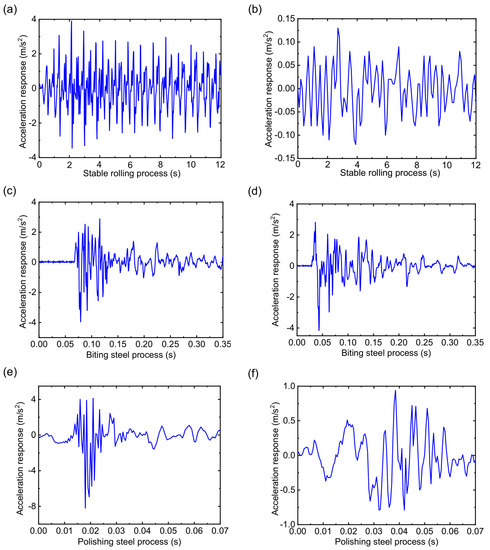 Transient acceleration response of the system: (a) stable rolling process of the 1.6 mm, (b) stable rolling process of the 3.2 mm, (c) biting steel process of the 1.6 mm, (d) biting steel process of the 3.2 mm, (e) polishing steel process of the 1.6 mm, and (f) polishing steel process of the 3.2 mm.
