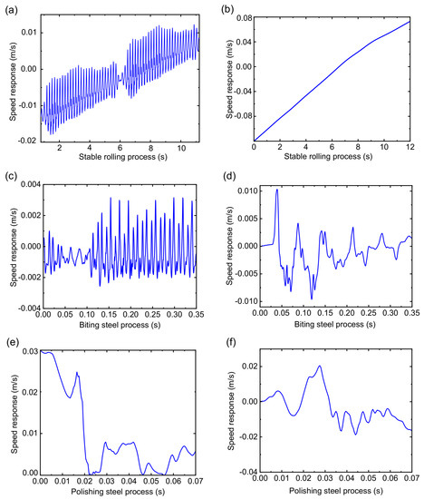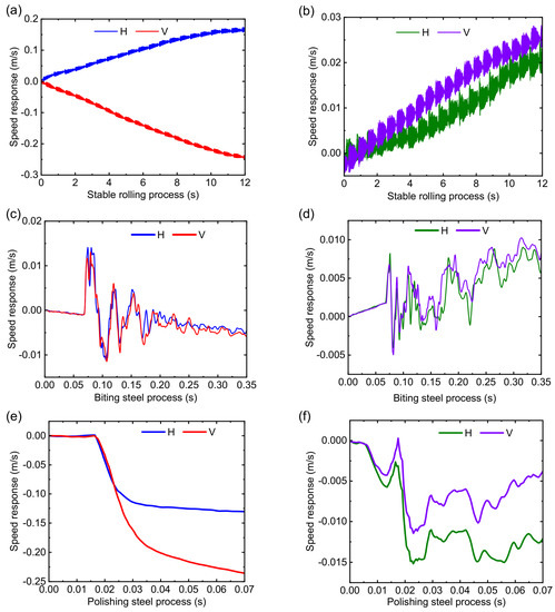 The speed response with the SPA-H of 1.6 and 3.2 mm is presented in Figure 10. The stability of the RBBH system decreases as the rolling speed continues to increase. The RBBH system has different speed characteristics when different strips are rolled. The speed change always fluctuates at the center line and forms a symmetrical trend due to the limitation of the gap between bearing housing and mill window. As shown in Figure 10a, the speed response of the RBBH system presents period changes, and is symmetrical at 0 m/s. On the contrary, the SPA-H of 3.2 mm shows a relatively stable state as shown in Figure 10b. During the biting and polishing steel process, the speed response presents complex changes as shown in Figure 10c–f because of many influencing factors. In addition, it can be known from the dynamic theory of gears and bearings that the increase in the rolling speed will lead to the decrease in the stability of the RBBH system. One of the applications of speed response is that reducing the rolling speed can well suppress the vibration of the rolling mill.