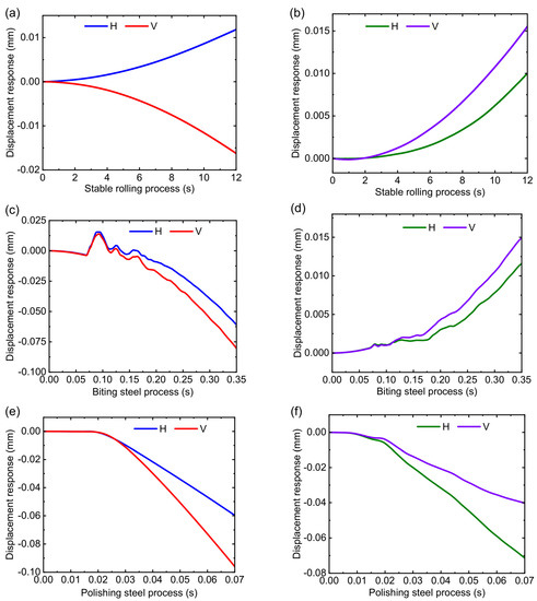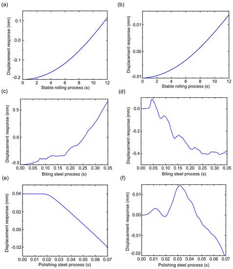 Transient displacement response of the system: (a) stable rolling process of the 1.6 mm, (b) stable rolling process of the 3.2 mm, (c) biting steel process of the 1.6 mm, (d) biting steel process of the 3.2 mm, (e) polishing steel process of the 1.6 mm, and (f) polishing steel process of the 3.2 mm.