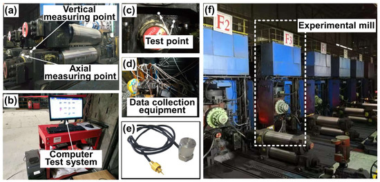 In order to verify the accuracy of numerical calculations an engineering test platform was designed and constructed to collect and analyze vibration data through piezoelectric acceleration sensors. The test platform is shown in Figure 12. Figure 12e presents the piezoelectric acceleration sensor, which is suitable for dynamic testing of the finishing mill with frequent roll changes because of high sensitivity and portability. The sensor converts the acceleration signal into a charge signal and transmits the dynamic signal to the computer (see Figure 12b) for recording and display through the charge amplifier and capture card. Accelerometers are installed on horizontal and vertical directions of the bearing housing on the operating side, as shown in Figure 12a,c.