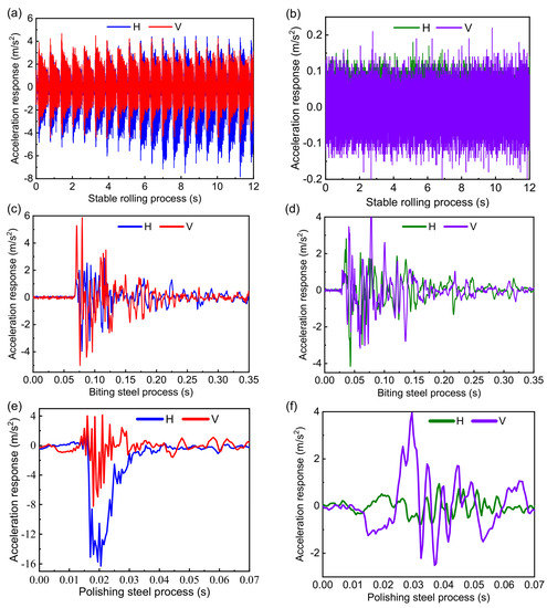 Signal processing results of the acceleration response in the biting process, the stable rolling process, and the polishing process are provided in Figure 13. As shown in Figure 13a,b, the stable rolling process shows obvious periodic fluctuations when the 1.6 mm is rolled, which leads to the changes in the dynamic characteristics and dynamic stiffness of the bearing. The acceleration response in the horizontal direction gradually increases to 4 m/s2 with the rolling time, and the essence is that the rolling speed gradually increases with the rolling process, which leads to a decrease in the stability of the system. The acceleration response in the vertical direction is always around 2 m/s2, essentially because of the limitation of the RBBH system by the support rollers in the vertical direction. The results of the experiment are less than half of the numerical results in both the horizontal and vertical directions, indicating that the numerical results are coupled results with the horizontal and vertical directions. Figure 13c,d show the acceleration response of the biting process. As can be seen from Figure 13c,d, the acceleration response of the biting process remains basically the same regardless of whether the finished thickness is 1.6 or 3.2 mm, which increases instantaneously to a peak and then gradually decreases to zero. Although the rolling process shows completely different dynamic characteristics under the premise that the strip thickness, rolling force, rolling speed, and tension are different, the overall pattern is the same. The rolling speed instantly drops from 3.5 to 0 m/s whether it is 1.6 or 3.2 mm in the polishing steel process, resulting in the dynamic characteristics of the RBBH system being basically the same, as seen in Figure 13e,f. However, the instantaneous amplitude of the polishing steel is much greater than 3.2 mm when the finished thickness of 1.6 mm is rolled, because the rolling conditions of 1.6 mm are much worse than 3.2 mm resulting in a more sensitive system stability. The experimental results are basically consistent with the numerical results in the acceleration response.