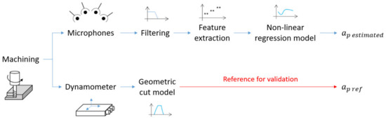 In the present work, different tests were carried out by varying the depth of cut, the feed rate and the rotational speed. From these tests, signals were obtained by means of four microphones and a dynamometer, which were processed by two different algorithms: one based on a regression model assisted by machine learning (Section 3) and the other based on the analysis of the geometric cutting model (Section 4).