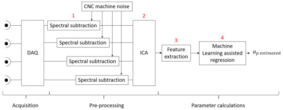 The next step works with the background noise of the system. Due to the nature of the microphones, they pick up all acoustic signals that are present in the vicinity of the workspace, in adjacent rooms and even reflected waves from the source. In order to be able to study the machining signal with minimal incidence from other sources, an independent component analysis (ICA) blind source separation algorithm was applied [37] (Figure 4, point 2).