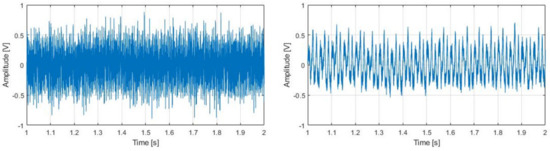 Signal from microphone no.1 introduced in the signal separation algorithm (left) and the machining signal resulting from the signal separation of the 4 microphones (right).