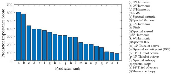 Additionally, any change in the values of the spindle speed was represented in the frequency spectrum by shifting the location of the harmonics to higher frequencies when the speed increased, and to lower frequencies when the speed was reduced. These changes were dependent on the frequency value of the fundamental harmonic, whose position was determined by the rotation frequency of the spindle. The influence of this phenomenon can be estimated by the following frequency-focused features: spectral flux (Figure 6b), spectral roll-off point (75%), pitch and spectral centroid (Figure 6c) [41].