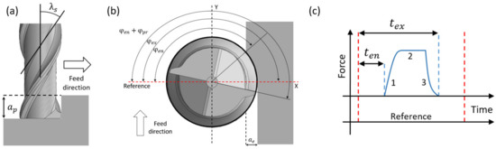 Machining conditions in a milling process can be obtained in terms of the geometrical characteristics of the cutting tool [3]. This implies that the depth of cut can be related to the tool angles (entry angle , exit angle , projected angle and helix angle ) as shown in Figure 8a,b.