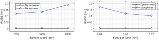 In general terms, the average values provided by the microphones were acceptable for a monitoring process, but did not achieve the accuracy of the direct contact measurement method. When machine learning is applied to the microphone signal, a dependence between the RMSE and the thickness of the cut chip could be observed (Figure 9), with the error increasing as the cutting speed increased or the feed rate was reduced.