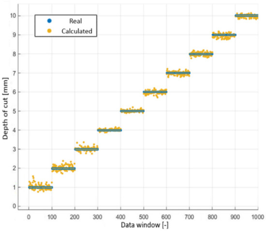 When the individual depths of cut were considered (Figure 10), it was noted that when the depth of cut was close to 1 mm, the system lost remarkable accuracy due to the reduction of the intensity of the acoustic emission, since it made it difficult to separate it from the rest of the noise present, having a signal-to-noise ratio of only 3 dB.