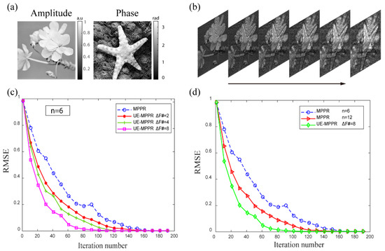 Figure 2d, with the increase in the number of the input recording planes, the initial convergence speed of the conventional MPPR method is slightly faster than that of UE-MPPR. However, when the number of iterations exceeds 30, the advantage of convergence speed is negligible. As the number of iterations reaches 12, the convergence speed of the two algorithms is almost the same. To achieve the same image quality, the conventional MPPR algorithm uses nearly twice the number of input recording planes of UE-MPPR. Nevertheless, the greater number of diffraction planes means more images need to be measured, which may cause more measurement time consumption and noise accumulation in practical applications. Meanwhile,