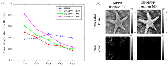 Figure 6c, was used as a measured sample.In comparison, the UE-MPPR finished the phase recovery with 100 iterations while the conventional MPPR takes 300 iterations. Comparing the reconstruction quality, there are some vague parts in