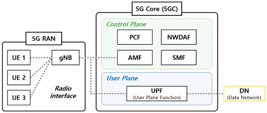 The 5G system architecture (5GS) includes a 5G access network (AN), 5G core network (5GC), and UE [26] (Figure 1) and is defined as service-based. The 5G (R)AN provides a wireless interface for the UE. The 5G base station (gNB) of the (R)AN provides the GTP to the UE. GTP is a tunneling protocol that is defined to carry data within mobile networks. The network packet generated from the UE is transmitted to the 5GC via GPRS tunneling through the (R)AN. GTP consists of a control plane (GTP-C), user plane (GTP-U), and charging (GTP’ derived from GTP-C) traffic [27].