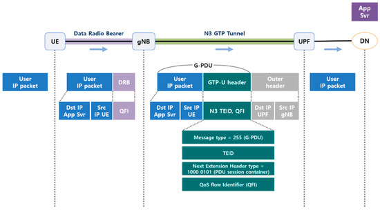 Figure 2 shows the uplink flow through the user plane of the 5G network traffic. The IP packet generated by the UE is forwarded to the gNB for transmission to the DN. When the gNB receives an IP packet, it encapsulates the IP packet in the GTP-U header. Subsequently, the packet is encapsulated inside the IP and UDP headers and is then transmitted to the UPF. The encapsulated IP packet and GTP-U header make up the G-protocol data unit (G-PDU). The GTP-U header consists of the message type, next extension header type, tunnel end-point identifier (TEID), and QoS flow identifier (QFI). The message type is fixed to decimal number 255 (0xff), indicating the G-PDU, and the next extension header type is fixed to binary number ‘1000 0101’ (0x85), indicating the PDU session container. The transmitted packet in the QoS flow is identified by the QoS flow identifier. TEID is an identifier uniquely assigned to each GTP user connection on each node [12].