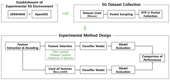 The experiment was conducted to establish a 5G environment, collect GTP packets, and detect DDoS attacks based on ML using GTP packets. This is shown in Figure 3, which is a structural diagram of the experiment. The subsections below describe each step of the diagram in detail.