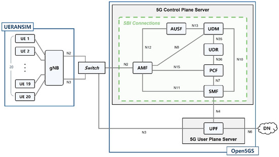 The environment for collecting 5G data was constructed using UERANSIM and Open5GS (Figure 4); the latter was used to implement a virtual 5G core network. Open5GS can build a private network only if the gNB, eNB, and USIM are available. Thus, the UE and gNB were constructed using UERANSIM, which supports 5G RAN control and user planes. The GTP packets to be used in the experiment were collected by dumping the switch equipment between the gNB and UPF.
