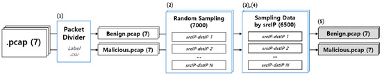 To configure the same environment (i.e., number of network packets used) for each attack, SYN DoS with the smallest number of network packets was applied as the standard. The number of sampled network packets was set to 6500 to account for possible losses during the process of classifying benign and malicious packets in a PCAP file. Furthermore, all source and destination IP pairs were taken into consideration to reduce the dataset bias that may occur during the sampling process. In addition, to avoid biased results, the number of benign to malicious network packets per attack was matched in a 1:1 ratio. The process of sampling 6500 packets, as shown in Figure 5, is described below.