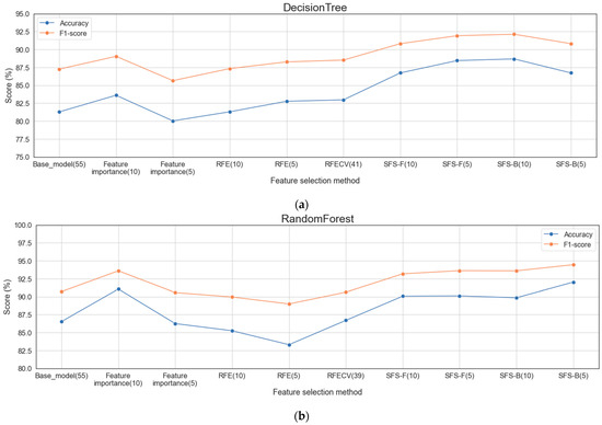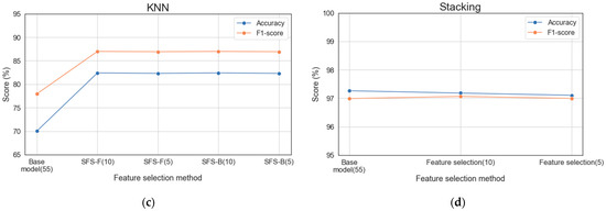 Accuracy and F1-scores of each classification algorithm for the base model and the model applying each feature selection method: (a) DT; (b) RF; (c) KNN; (d) Stacking.