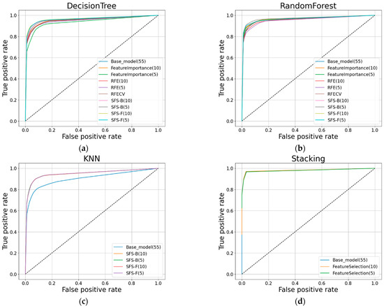 ROC curves of each classification for the base model and the model applying each feature selection method: (a) DT; (b) RF; (c) KNN; (d) Stacking.
