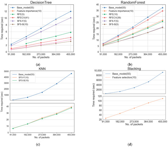 Figure 8 and Table 13 show the time complexity change according to the dataset size change. When all features were used, the required time increased remarkably as the dataset increased. In particular, KNN, which compares all data, and stacking, which is an ensemble technique of several models, showed the time required in units of the hour as the data increased. However, both algorithms maintained the required time in units of seconds when using features selected for feature selection. In particular, the stacking algorithm, which showed the best performance, showed a greater rate of change (between the base model and the model using feature selection) as the dataset increased. When 364,000 packets were used for the stacking algorithm, the time required for the base model was increased by 57.6 times compared to the time required for the model using feature selection, and in the case of using 455,000 packets, it increased by 84.07 times. As a result, as the dataset increases exponentially, the difference in time complexity between the base model and the model to which feature selection is applied will gradually increase.