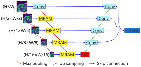 Multiresolution aggregation transformer UNet (MRA-TUNet). Conv: convolution block. MRAM: multiresolution aggregation module. CvT: convolution to vision transformer. OFSM: output feature selection module. H: image height. W: image width.