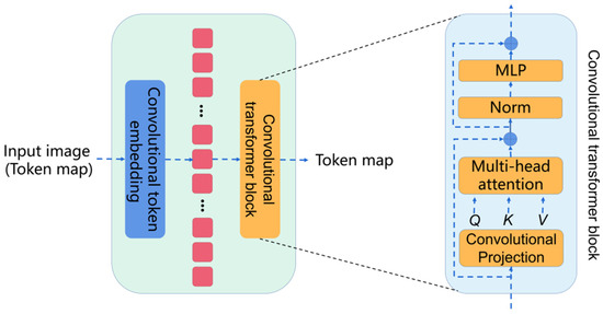 Convolutional vision transformer (CvT) introduces convolutions into the vision transformer. The basic module of the CvT is shown in Figure 3, which is mainly composed of two parts: