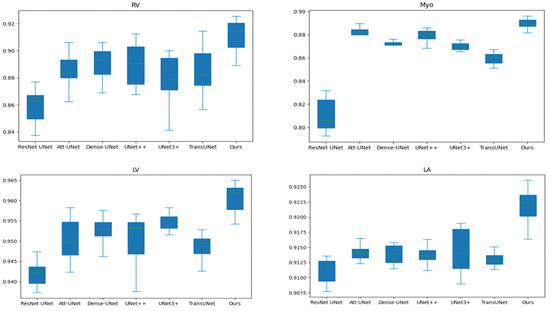Table 2 and Table 3 compares our results to state-of-the-art (SOTA) methods: ResNet UNet [17], Att-UNet [18], Dense-UNet [19], UNet++ [21], UNet3+ [23], TransUNet [30], Swin-UNet [31], and nnFormer [34]. In order to exclude the interference of random factors, we run each method 10 times to obtain the average value. Figure 5 shows the box and whisker plot on the right ventricle (RV), myocardium (Myo), left ventricle (LV), and left atrium (LA). As shown in Table 2 and Table 3 and Figure 5, our method outperforms TransUNet on all performance metrics, further demonstrating the effectiveness of our proposed method. In addition, our method achieves the best performance on most performance metrics.