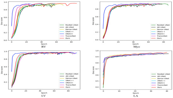 Table 4 compares the average training time of various methods on the ACDC and the 2018 ASC. As shown in Table 4, the number of parameters of our method is not particularly large, but the training time is longer than other methods because our method has more skip connections and is more difficult to train. Medical image segmentation does not require high real-time performance, and our method has a certain improvement in segmentation performance compared with TransUNet. Therefore, our method has certain practicability. Figure 6 shows the variation of the training set dice score with iterations. The ACDC is small and the model is prone to overfitting. Therefore, the training set dice score is not as large as possible, but some fluctuations are better, which can jump out of the local optimum. The 2018 ASC is large and the model is not prone to overfitting. Therefore, the larger the training set dice score, the stronger the model fitting ability and the better the performance. The training set dice score of our model on the ACDC has large fluctuations, indicating that our model has a good ability to jump out of the local optimum. The training set dice score is large on the 2018 ASC, indicating that our model has good fitting performance. On the whole, our model can balance the fitting performance and generalization performance and achieve relatively good comprehensive performance.
