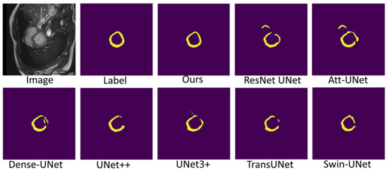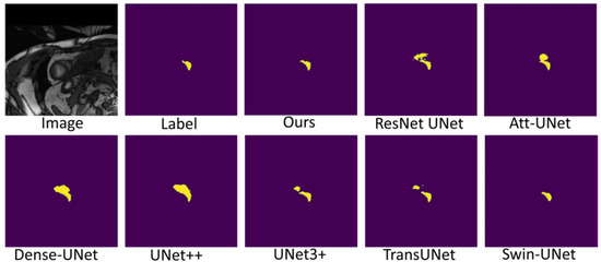 Figure 7, Figure 8 and Figure 9 shows the visualizations on the right ventricle (RV), myocardium (Myo) and left ventricle (LV), respectively. As shown in Figure 7, our proposed method correctly segmented the clearly visible right ventricle and significantly reduced right ventricle mispredictions. Myocardium is a difficult tissue to segment; it is a circle on most slices. As shown in Figure 8, the segmentation results of other methods do not form a complete circle; only our method accurately predicts the result and forms a complete circle. The left ventricle is the tissue that is easier to segment. As shown in Figure 9, the segmentation results of other methods still have some mispredictions for left ventricle segmentation, and our method segmented the left ventricle perfectly.