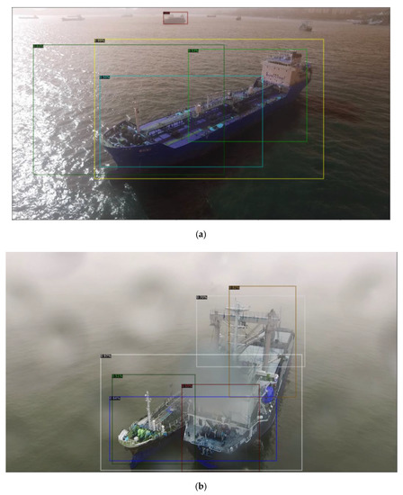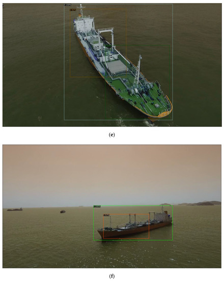 Figure 6 shows the classification results of ships classified by the Faster R-CNN model. Looking at the results of the following images, the accuracy of the classification of the bounding box is high in the case of a relatively simple ship, as shown in Figure 6d. However, in the case of the ship shown in Figure 6a–c,e,f, recognition errors occurred because the ship structures were classified as separate ships.