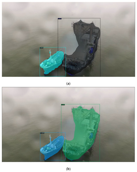 The experiment in Table 2 shows the results obtained by comparing the performance of the Bounding Box by additionally learning the R50-C4 3x, R50-DC5 3x, and R50-FPN 3x backbone networks of Mask R-CNN. The ship image in Figure 7 is an image taken by the drone performing a maritime delivery service on a rainy day. It is difficult to identify the ship because water droplets rain on the drone and block its camera. Nevertheless, we could confirm that Mask R-CNN, which has undergone additional training, showed higher performance than Faster R-CNN. However, it is not easy to use drones in rainy conditions. The video data are a case in which it was not raining when the drone took off, but it suddenly rained during the process of approaching the ship. This is a very small part of the dataset, but it is judged that the drone may not recognize the ship depending on the degree of water drops, although the drone accurately recognizes the ship on a clear day. Nevertheless, the instance segmentation model Mask R-CNN, which can classify objects at the pixel level, shows relatively better performance than Faster R-CNN.